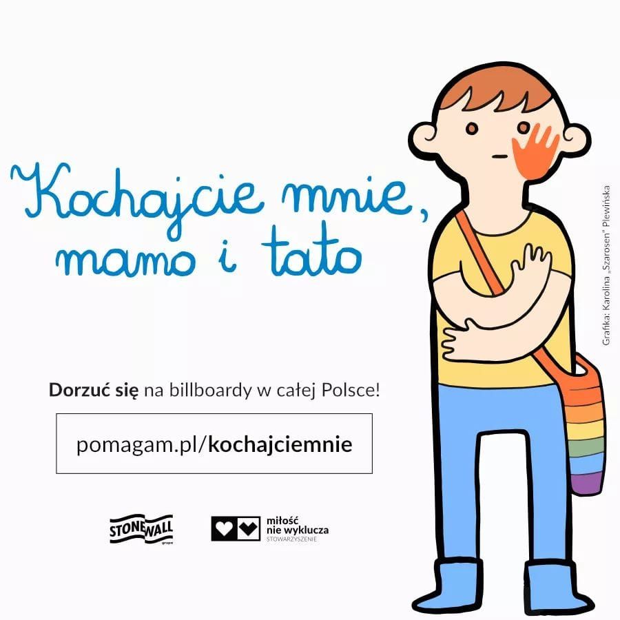 Jakiś czas temu Polskę zalały billboardy antyrozwodowe z zapisanymi niby dziecięcą ręką słowami „Kochajcie się, mamo i tato”. Wcześniej mieliśmy do czynienia z kampanią antyaborcyjną, czyli billboardami reklamującymi tzw. hospicja perinatalne, zawierającymi „prośby” dzieci, by ich nie zabijano. Akcję przeprowadziła Wspólnota Trudnych Małżeństw Sychar. Następnie ta sama organizacja postanowiła zwrócić się z apelem do rodziców, by się nie rozwodzili – utrzymanym w podobnej konwencji, tj. ze słowami napisanymi niby ręką dziecka na billboardzie. Teraz Grupa Stonewall we współpracy ze stowarzyszenim Miłość Nie Wyklucza i ilustratorką Karoliną „Szarosen” Plewińską zainicjowała akcję nawiązującą do Sychar, z tym że jej bohaterem stało się dziecko reprezentujące społeczność LGBT+, a obok niego widnieją słowa „Kochajcie mnie, mamo i tato”. Zbiórka na kampanię trwa – w zaledwie 2 dni udało się zebrać ponad 400 000 złotych.