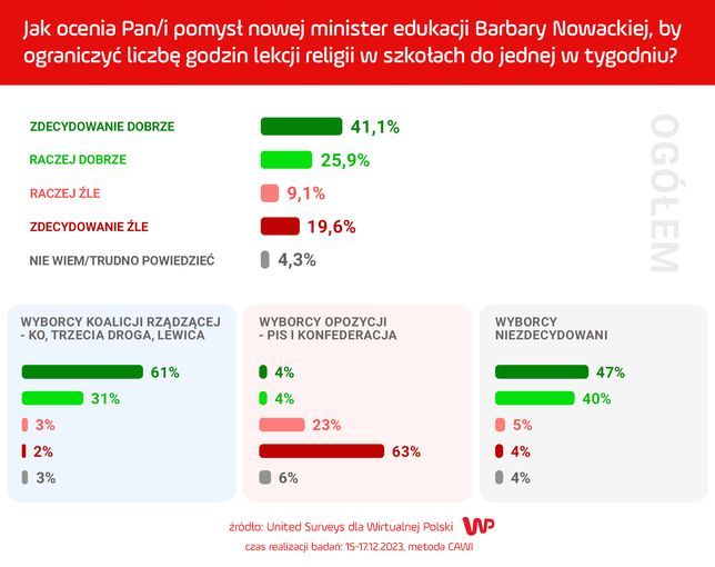 Z najnowszego sondażu przeprowadzonego dla Wirtualnej Polski przez United Surveys wynika, że większości osób przypadł do gustu pomysł ministry Nowackiej, aby ograniczyć liczbę godzin religii w szkołach do jednej w tygodniu. Aż 67 proc. ankietowanych ocenia go pozytywnie (41,1 proc. – „zdecydowanie” i 25,9 proc. – „raczej dobrze”). Innego zdania jest 28,7 proc. respondentów (9,1 proc. – „raczej źle” i 19,6 proc. – „zdecydowanie źle”). 4,3 proc. zaznaczyło, że nie posiada na ten temat zdania. Sondaż przeprowadzony został w dniach od 15 do 17 grudnia na grupie 1000 osób.