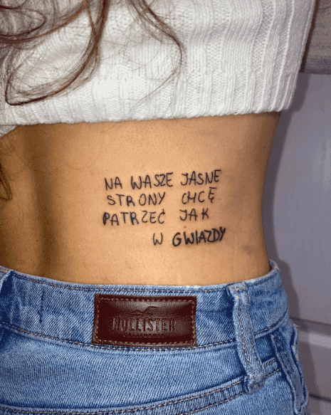 Robiłem pracę z jedną dziewczyną i to było bardzo trudne, i dla mnie, i dla niej, bo ona opowiedziała mi o swoim doświadczeniu wychodzenia z przemocowego związku. Chciała, żeby ten tatuaż to był taki tekst, który za nią to zamknie, więc to było emocjonalnie ciężkie, też dlatego, że to była dla niej szalenie ważna rzecz, ale czułem się też niezwykle wdzięczny za to, że tak się otworzyła i czuła się komfortowo z tym, że zrobiliśmy to razem. Tym bardziej, że jednak tatuaż to też praca z ciałem i ogromna intymność, która z założenia opiera się na kontakcie fizycznym. To była jedna z najbardziej zapamiętanych przeze mnie prac.