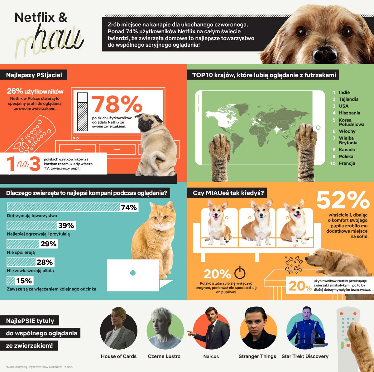 Okazało się również, że właściciele psów i kotów mają różne preferencje dotyczące oglądanych seriali. Ci pierwsi wolą "House of Cards" czy "Narcos", drudzy preferują "The Crown" lub "Stranger Things". Natomiast wszyscy razem zgodnie śledzą losy bohaterek "Orange Is The New Black".