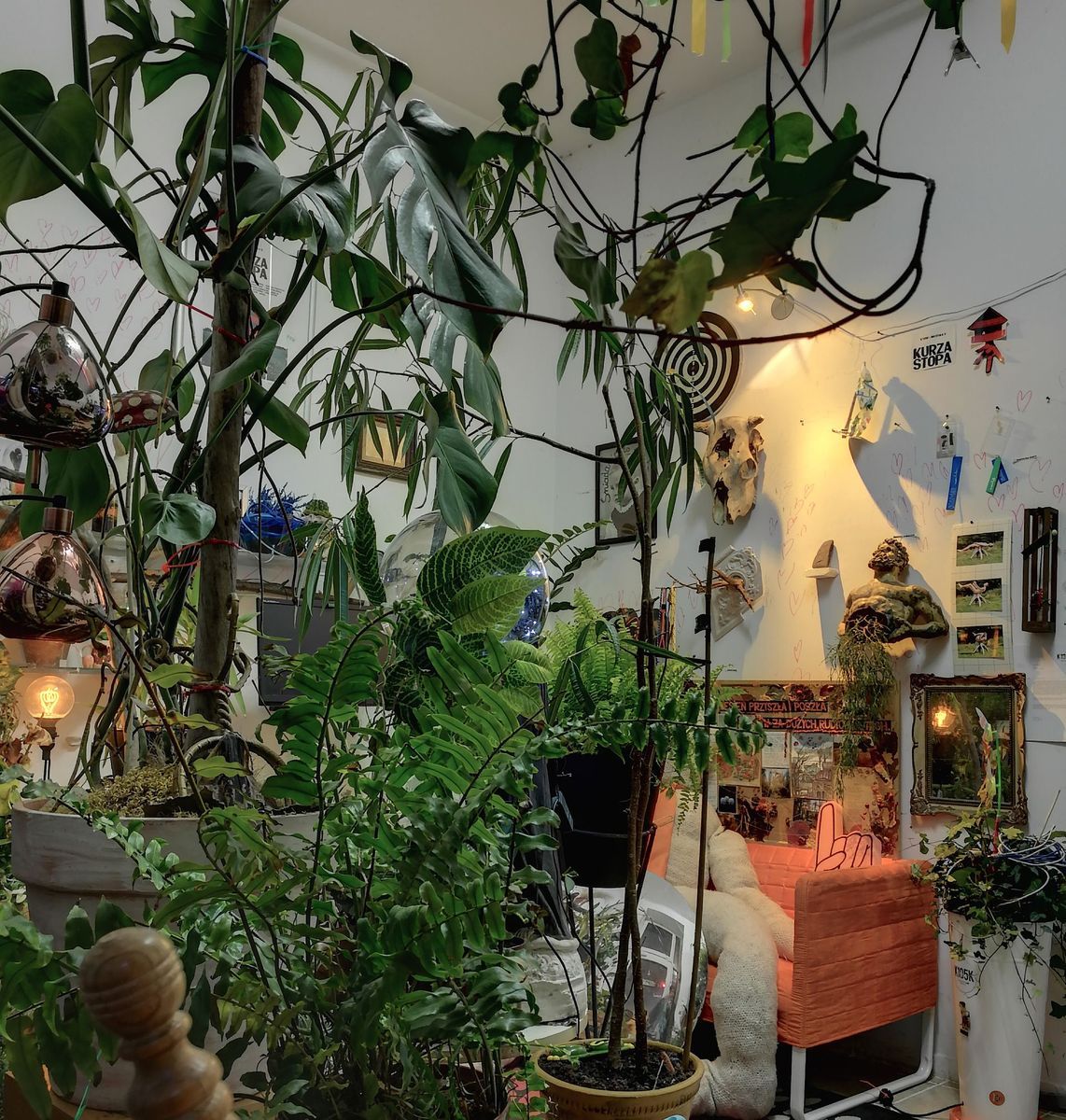 Flora czasem przychodzi do nas sama – zawsze wszystko chętnie przyjmiemy. Czasem szabrujemy ją z lasu – chwasty i suche gałęzie też są spoko – albo ratujemy od jakiś ludzi. W zimę część roślin jest przenoszona do cieplejszego miejsca, bo nasza mała wnęka jest nieogrzewana.