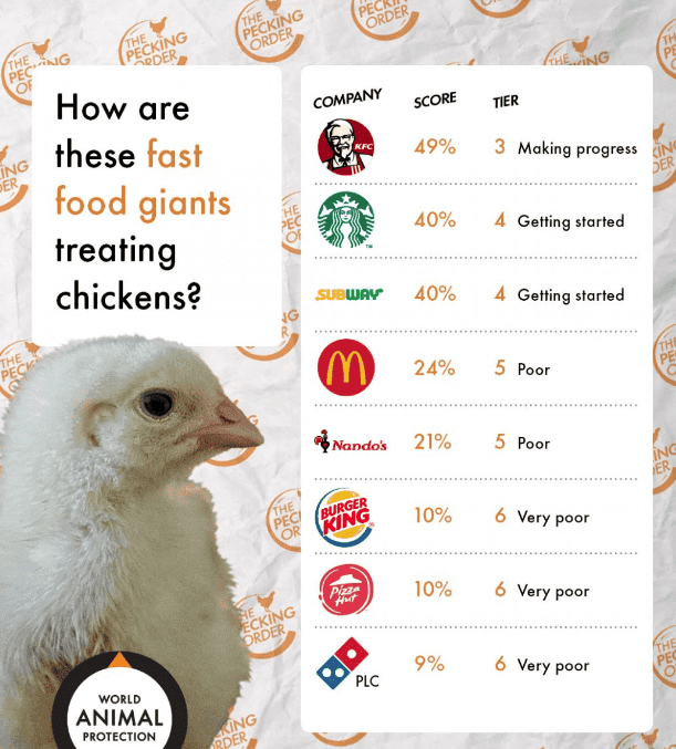 Najgorzej wypadły trzy sieci restauracji: Domino's Pizza, Pizza Hut oraz Burger King. Trochę wyżej w rankingu znalazł się McDonald's oraz południowoafrykańska sieć Nando's. Z zestawienia wynika również, że w dobrym kierunku bardzo powoli zmierza Starbucks i Subway, lecz zmierzały w nim już na początku 2019 roku, a od tamtej pory nic się nie zmieniło. Zaskoczyć może miejsce pierwsze, które należy do KFC. Według World Animal Protection to właśnie KFC zrobiło największy progres. W dużej mierze jest to zasługa petycji podpisanej przez ponad pół miliona osób. Dzięki niej restauracja zmieniła swoją politykę wobec zwierząt i podpisała zobowiązanie "Better Chicken Commitment".