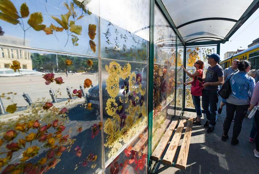 Suszone niezapominajki, bratki, różyczki, stokrotki, kolorowe listki, goździki, trawy i paprotki. Wszystko zatopione w żywicy i umieszczone na ścianach wiaty przystankowej. Efekt? Nierealnie śliczny. Projekt „Nostalgia” ozdobił przystanek przy pl. Dąbrowskiego, niedaleko Teatru Wielkiego.