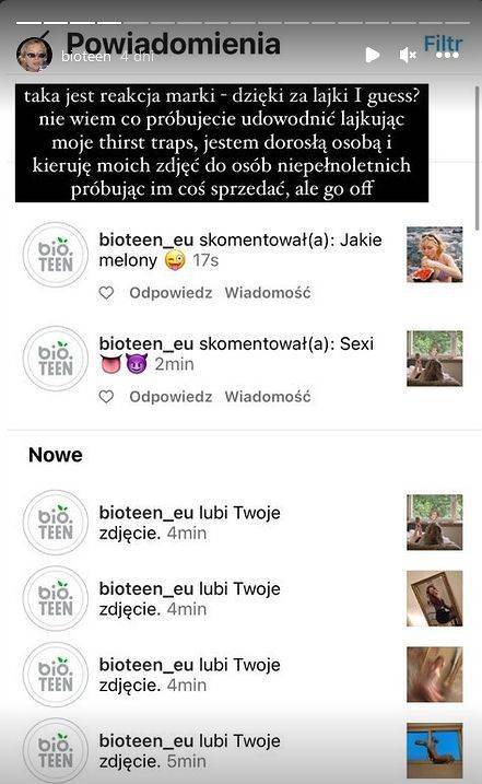 Dalej zrobiło się jeszcze dziwniej. Marka skontaktowała się z Liczbińską, ale nie po to, aby przyznać jej rację lub przeprosić, lecz po to, aby... przyczepić się do jej zdjęć. „Dziękujemy bardzo, każda krytyka jest ważna dla nas. My nic nie ukrywamy, tak samo, jak Pani na niektórych swoich zdjęciach” – odpisała marka na Instagramie. Polubiła także kilka jej zdjęć, zostawiając pod niektórymi niesmaczne komentarze typu „Jakie melony” czy „Sexi”. Liczbińska się nie ugięła, odpowiadając, że jest osobą dorosłą i nie kieruje swoich zdjęć do osób niepełnoletnich, próbując im coś sprzedać.