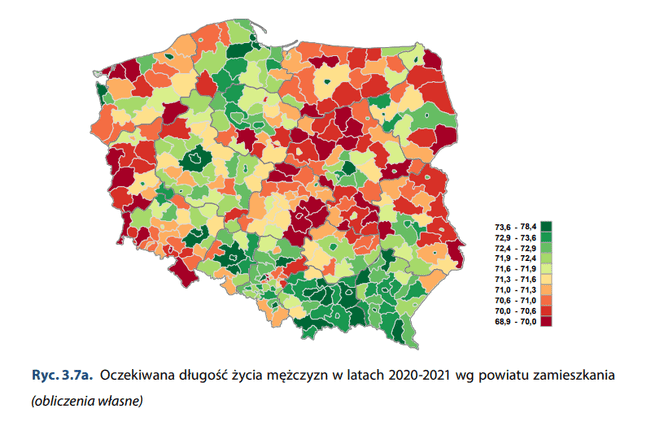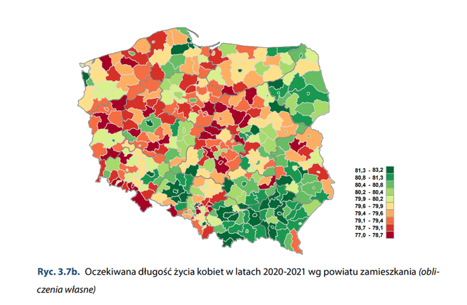 Jak możemy przeczytać w raporcie, największą odnotowaną długość życia w latach 2020-2021 obserwujemy wśród mieszkańców i mieszkanek Sopotu (w przypadku kobiet było to 78,4 roku, a mężczyzn 83,2 roku). Najkrótszą długość życia mężczyzn odnotowano w powiecie makowskim (województwo mazowieckie) i wyniosła ona zaledwie 68.9 roku. W przypadku kobiet najkrócej żyły mieszkanki Chorzowa – 77 lat.