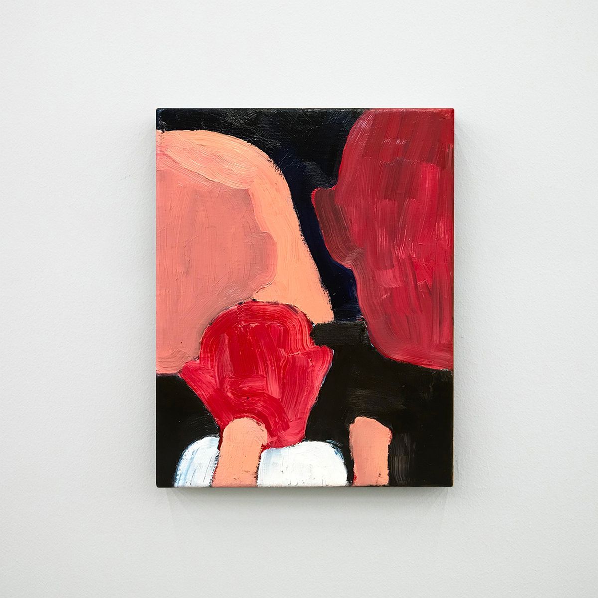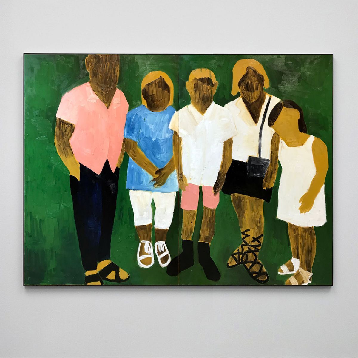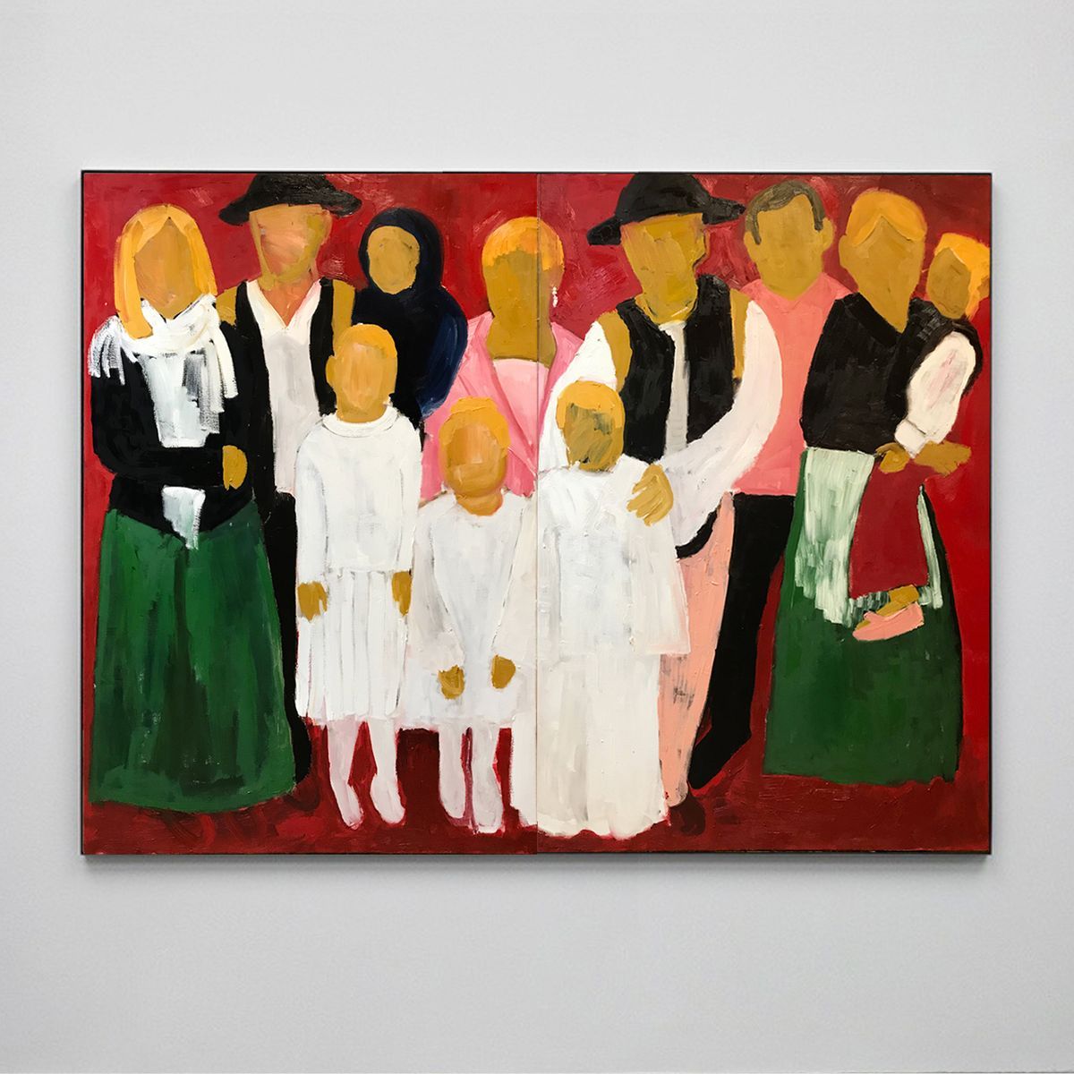 Cały czas się nad tym zastanawiam. Maluję je ze zdjęć znalezionych u tych samych mężczyzn, których malowałem w poprzednim cyklu – już wcześniej zwróciłem uwagę na to, że wrzucają do sieci bardzo dużo zdjęć swoich rodzin. Większość jest z jakichś rodzinnych wydarzeń: komunii, urodzin, Świąt, chrzcin. To mnie bardzo zaciekawiło: z jednej strony jest nienajlepsza kondycja polskich rodzin, a z drugiej jest ten wizerunek wiekuistego szczęścia. Pozujemy, uśmiechamy się, jesteśmy odświętnie ubrani. Dla mnie to był uderzający kontrast: to, jak rodzina jest postrzegana, a jak może wyglądać w rzeczywistości.