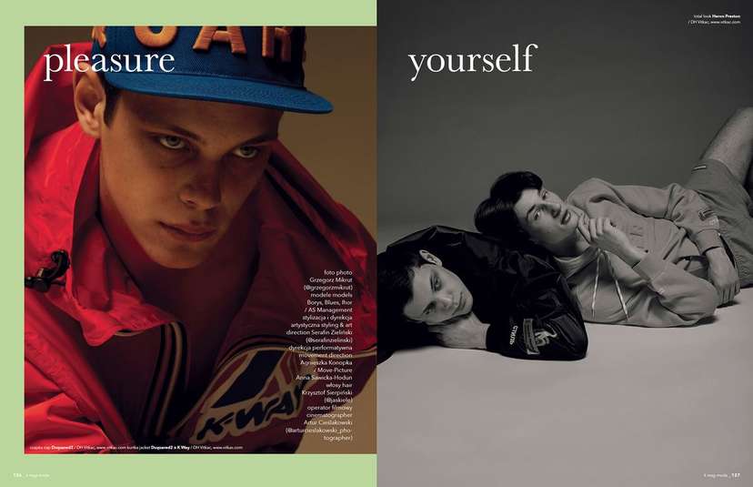 Sesja Pleasure Yourself do bieżącego numeru K MAG 92 SPORTY ISSUE jest mocnym męskim akcentem. Mimo typowo sportowej tematyki Mikrut połączył ją z subtelnością, przeplataną wyrazistymi kolorami, które nadały jej oryginalnego charakteru. Ze zdjęć emanuje pozytywna energia, która udziela się także samym odbiorcom. Sportowe stylizacje, radość i skupienie na twarzach modeli, zawieszenie ich sylwetek w ruchu, tworzą unikatowy klimat, przez który sami mamy ochotę włożyć dresy. Sesja autorstwa Mikruta to hołd dla dojrzewającej męskości oraz mody męskiej.