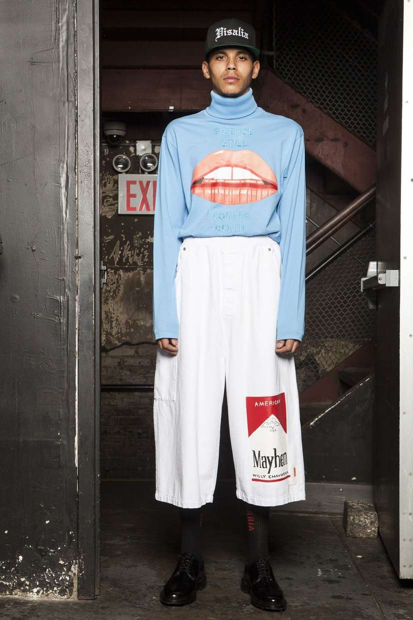 Na błękitnym golfie umieszczono hasło „Silence Still Equals Death”. „Silence = Death” to slogan, który podczas epidemii HIV/AIDS pod koniec lat 80. zaczął masowo pojawiać się na transparentach, ubraniach czy przypinkach osób walczących o prawa LGBTQQI. W swojej pracy hasło wykorzystał również artysta pop-artowy Keith Haring. Napis „Silence = Death” najczęściej występuje na czarnym tle w towarzystwie różowego trójkąta z czubkiem uniesionym do góry (odwrócony różowy trójkąt znakował homoseksualnych więźniów w nazistowskich obozach koncentracyjnych). „Silence = Death” było jednym z głównych haseł amerykańskich manifestacji skierowanych przeciwko homofobicznej postawie Ronalda Reagana, który bardzo długo ignorował fakt, że w wyniku epidemii HIV/AIDS w jego kraju zmarło kilkadziesiąt tysięcy obywateli. Prezydent najpotężniejszego państwa na świecie wolał udawać, że choroba nie istnieje lub dotyczy jedynie wyrzutków, przestępców, zboczeńców – osób, którym „należy się” cierpienie. „Silence Still Equals Death”, mówi Willy Chavarria w 2017 roku. Być może w ten sposób nawiązuje do antyrównościowej polityki Donalda Trumpa, odwołuje się do wzrostu zakażeń wirusem HIV, który trapi nas w ostatnich latach. „Resistance is Power” – to kolejne słowa z koszulki, obok których widnieje czerwona, zaciśnięta pięść. Willy Chavarria prześwietla archetypy męskości z drugiej połowy XX wieku i ikony amerykańskiego konsumpcjonizmu. W kolekcji „Cruising” sporo jest również odniesień do mody hip-hopowej, odzieży wojskowej, uniformów amerykańskich mechaników, pracowników stacji benzynowych, strażaków, motocyklistów. Wszystkie nadruki stworzył kalifornijski malarz Brian Calvin, przyjaciel kreatora, reinterpretując między innymi szatę graficzną opakowania papierosów i logo piwa.