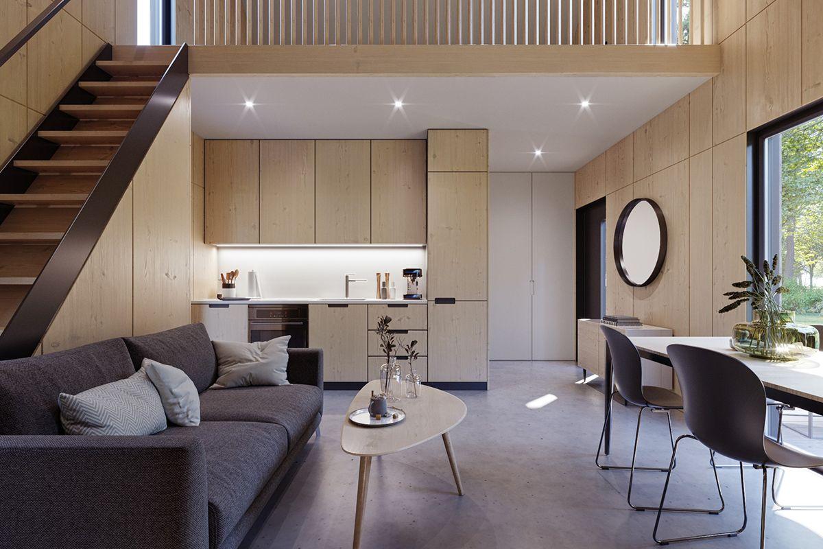 Modulo dostępny jest w trzech wersjach. Pierwsza to ta najmniejsza, wyposażona w antresolę. Idealnie sprawdzi się dla dwóch osób. Dostępny jest jeszcze wariant z poddaszem oraz wersja trzecia, największa, która powstaje z połączenia dwóch modułów i przeznaczona jest nawet dla 6-osobowej rodziny. Twórcy dają również trzy możliwości wykończenia budynku: standard, optimum i premium. Ostatnia opcja oznacza ostatecznie wykończone wnętrze, w którym dominuje ciepłe, jasne drewno. Dla kontrastu zaplanowano grafitowe ramy okien oraz szare meble.