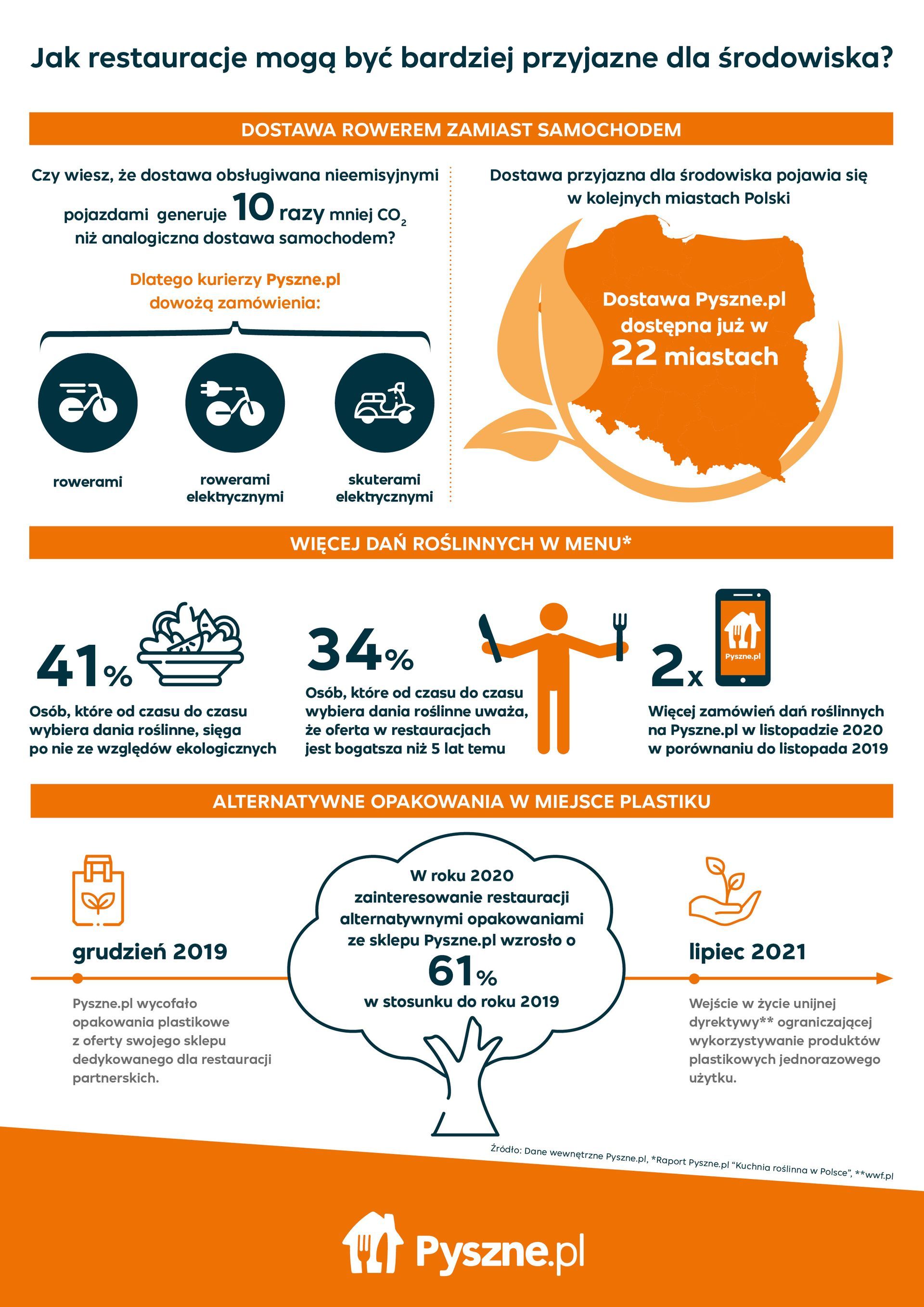 Serwis Pyszne.pl już 1 grudnia 2019 roku usunął z oferty swojego sklepu internetowego dedykowanego dla restauracji partnerskich opakowania plastikowe. W to miejsce zostały wprowadzone alternatywne produkty - nie tylko służące do transportu żywności (m.in. torby papierowe, torebki biodegradowalne wykonane ze skrobi kukurydzianej), ale również drewniane sztućce czy nadające się do recyklingu opakowania na jedzenie.