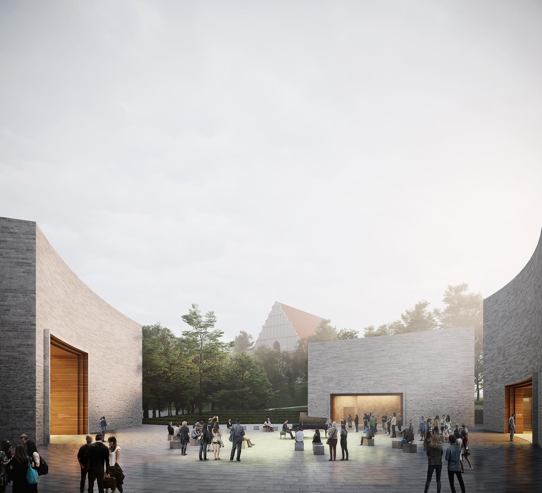 „Układ urbanistyczny czterech niezależnych od siebie bloków funkcjonalnych zakreśla osie komunikacyjne i widokowe – z ekspozycją historycznego krajobrazu Wzgórza Świętego Wojciecha. Rozdzielenie siedziby muzeum na mniejsze bryły pozwala zarówno na zachowanie większej skali zieleni wokół, jak i podkreślenie roli bezpośredniego świadka historii, jakim jest wspomniany kościół” tłumaczą architekci.