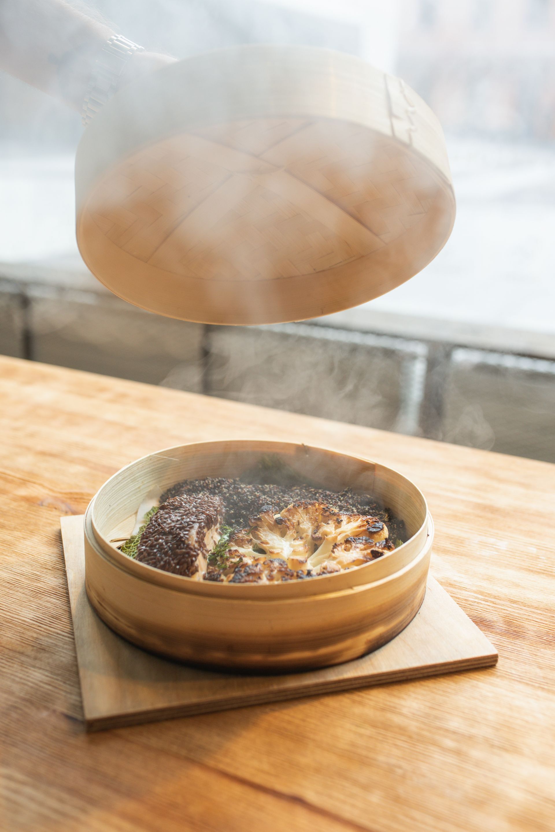 Nieco inaczej – jak to u nas – podajemy parującego łososia ze stekiem z kalafiora, czyli kolejne danie powstałe w zgodzie z filozofią zero-waste.