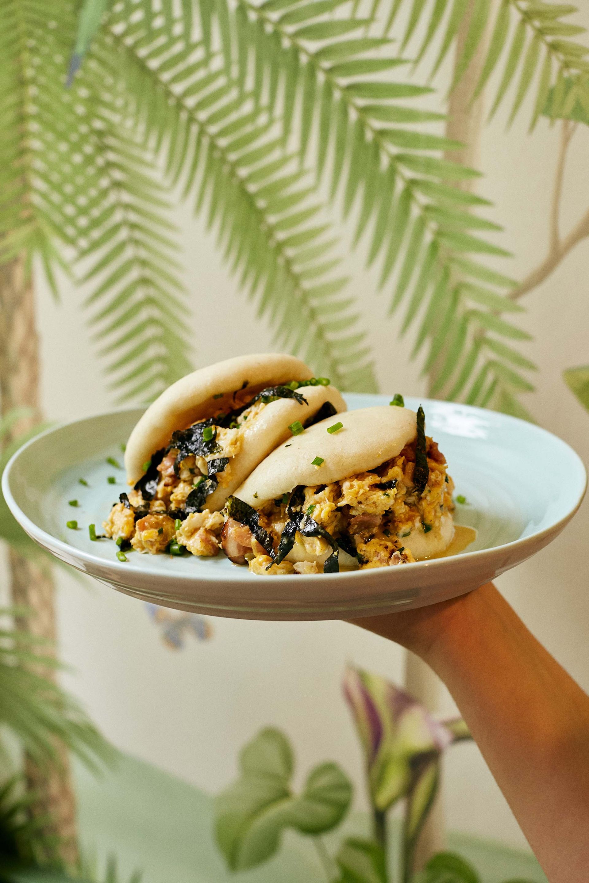Jajecznica z boczkiem, szczypiorkiem, płatkami nori i majonezem wasabi podawana w bułeczkach bao.