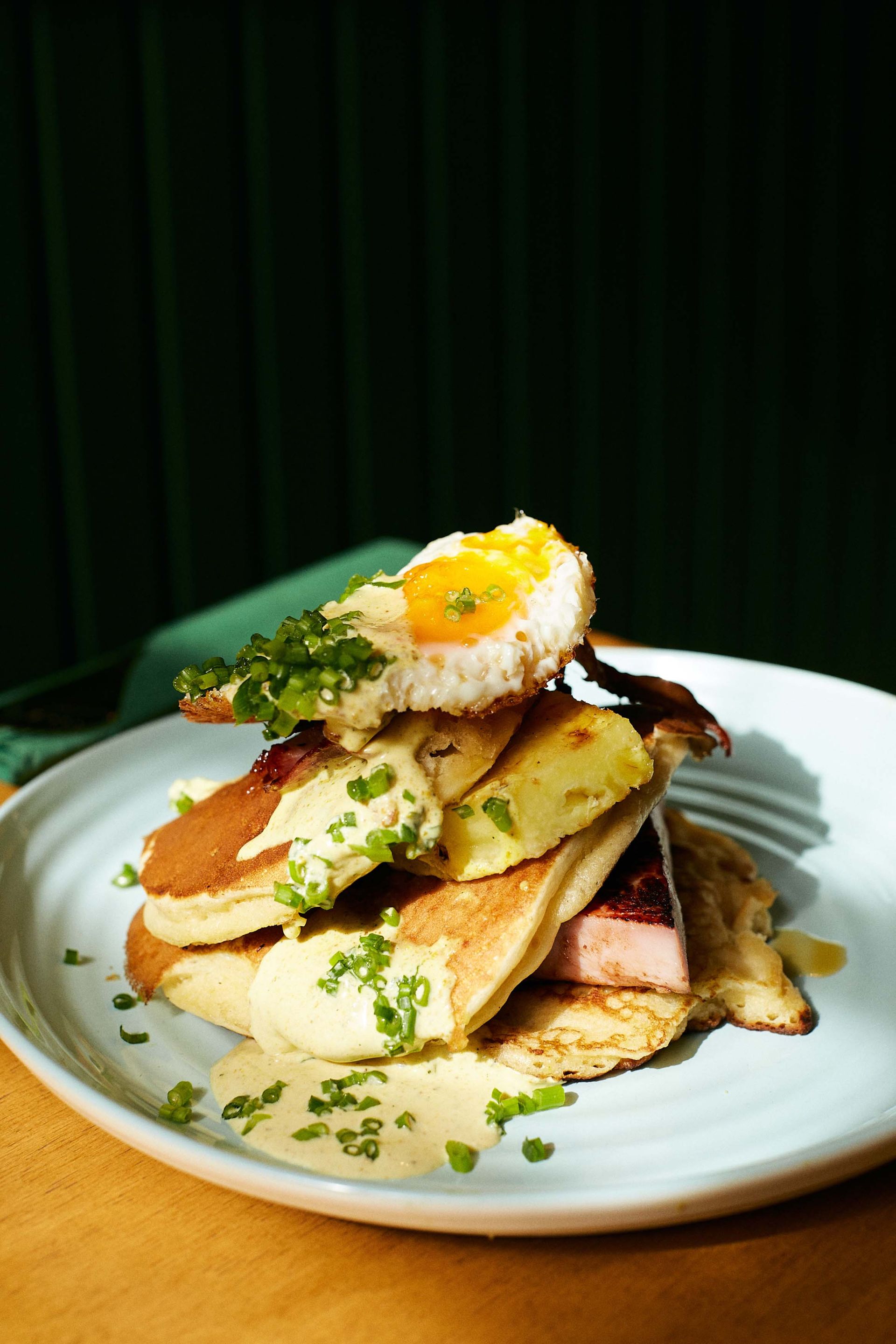 Puszyste pancakes z bekonem, szynką spam, grillowanym ananasem, jajkiem sadzonym i sosem mango curry.
