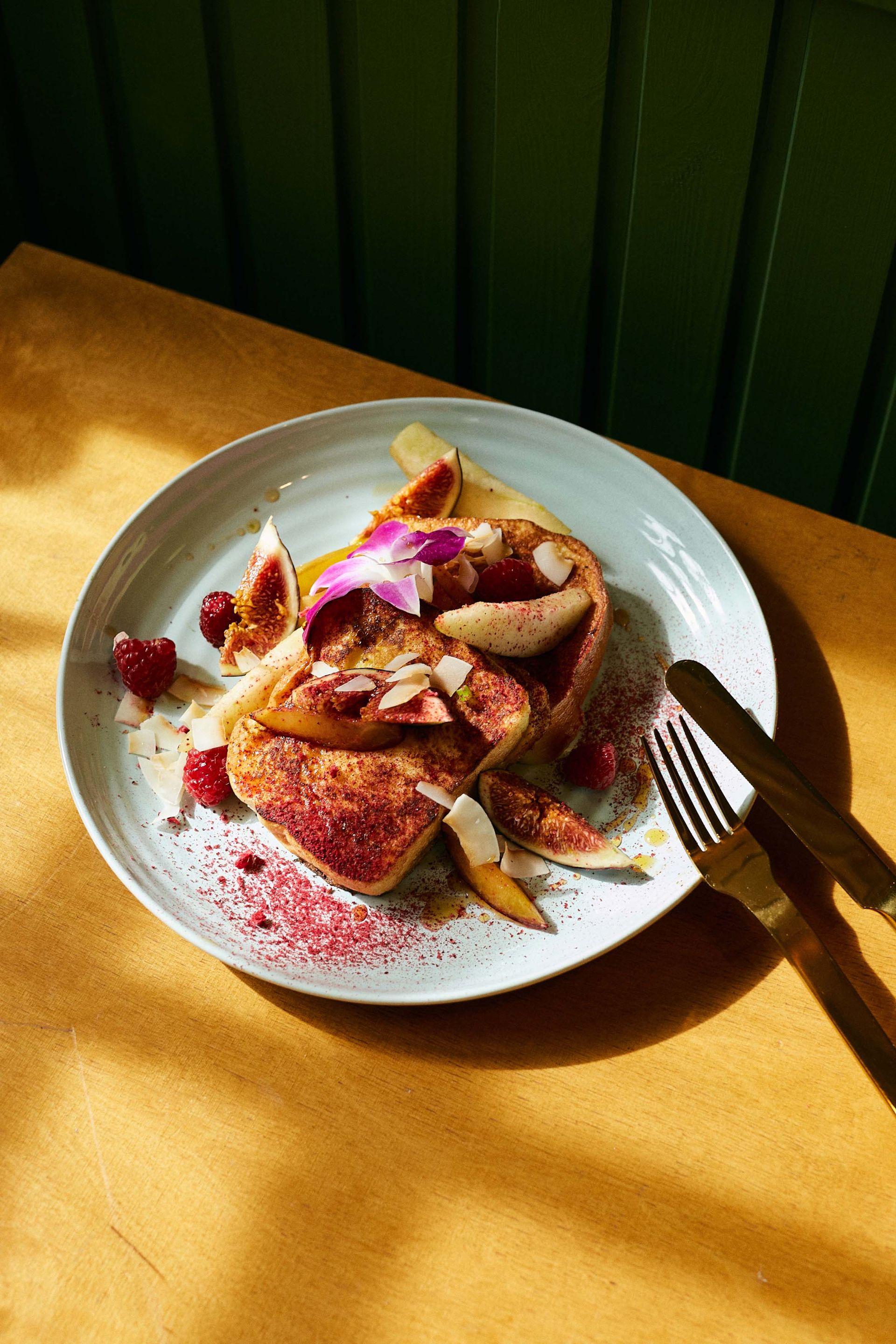 Tosty francuskie nasączone mlekiem kokosowym, podane z karmelizowanymi owocami, pudrem z malin i syropem klonowym.