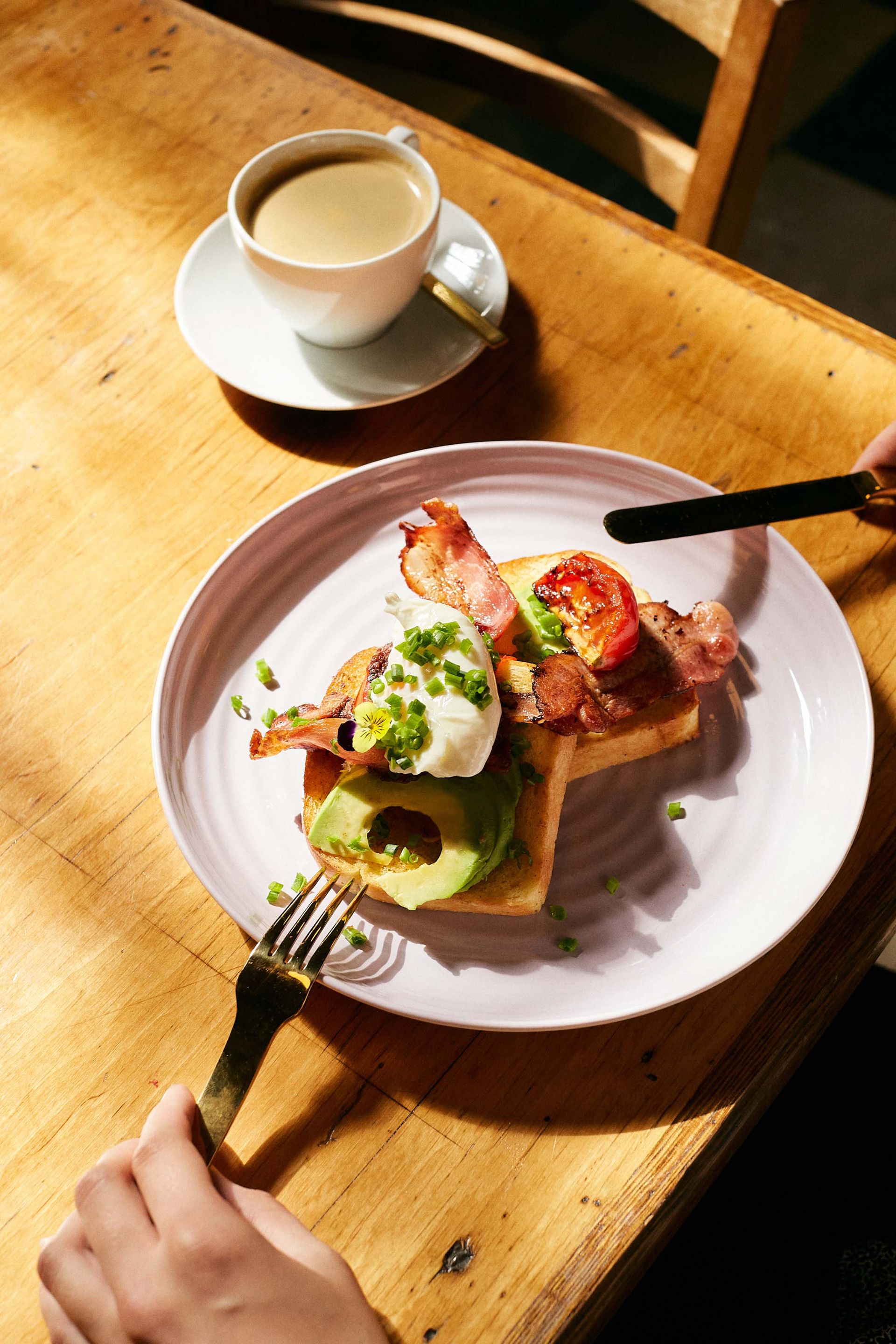 Tosty z grillowanym pomidorem, avocado, bekonem i jajkiem poche lub tosty z marynowanym łososiem, serkiem wasabi, awocado, kawiorem tosago i kiełkami rzodkiewki.