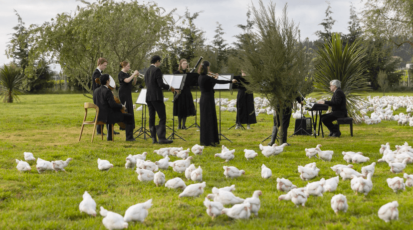W tych strojach mogliby zaprezentować się na najważniejszych scenach świata, ale zamiast tego pojawili się na farmie Hawke Bay, gdzie wykonali „Chook Symphony No 1” – utwór stworzony specjalnie dla kur. Wszystko odbyło się w ramach współpracy orkiestry z ekologiczną farmą kurczaków żyjących na wolnym wybiegu.