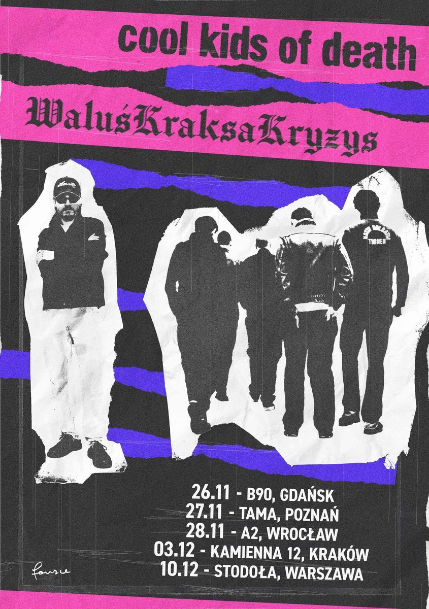 Ci artyści mieli już okazję dzielić scenę podczas koncertów Męskiego Grania, gdzie wspólnie wykonywali kultowy utwór „Butelki z benzyną i kamienie”. Teraz dwa pokolenia post-punkowego buntu, czyli Cool Kids of Death oraz WaluśKraksaKrzyzys, wyruszają we wspólną trasę koncertową.