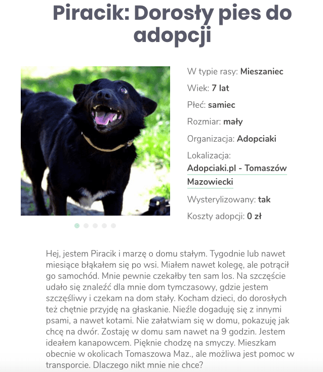 W każdym ogłoszeniu w wyszukiwarce Wamiz znajdziemy szereg informacji na temat danego psa lub kota wraz jego krótkim opisem. Do podstawowych danych zalicza się m.in. imię pupila, jego wiek, rozmiar, lokalizację oraz nazwę organizacji, która za niego odpowiada, a także, czy jest wysterylizowany. Opis sporządzają pracownicy mający ze zwierzęciem kontakt. Zawiera nawyki czworonoga, jego upodobania, dziwactwa oraz historię. Niestety, nie zawsze przyjemną. Koszt takiej adopcji, to... 0 złotych.