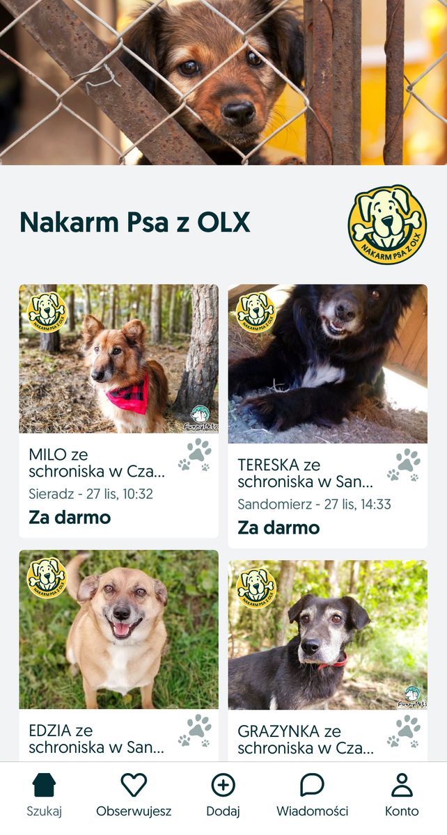 W ramach akcji „Nakarm psa z OLX" na stronie Ratujemy Zwierzaki jest także prowadzona zbiórka na podopiecznych Schroniska Funny Pets w Czartkach i Przytuliska Dla Bezdomnych Psów w Sandomierzu. Dotychczas udało się uzbierać ponad 16 tysięcy złotych, ale wciąż brakuje dwa razy tyle.