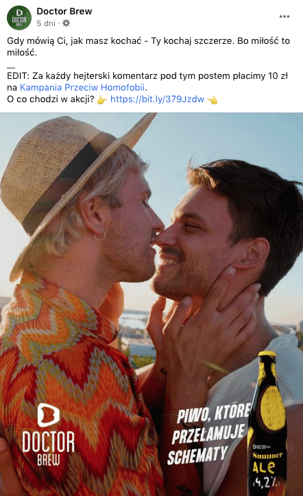 Kilka dni temu na profilu facebookowym Doctor Brew, rodzimego producenta piwa, pojawiła się odsłona najnowszej kampanii marki, w której główną rolę odgrywa para gejów. Jak można się domyślić, reklama wywołała lawinę negatywnych komentarzy, które marka postanowiła przekuć w coś dobrego. Za każdy hejterski wpis pod postem Doctor Brew przekazuje 10 zł na rzecz Kampanii Przeciw Homofobii.