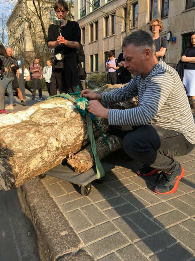 Pień został umieszczony na wózkach i razem z trzydziestoosobowym konwojem zaczął toczyć się w kierunku prezydenckiej siedziby. Mimo że była wymagana pomoc kilku innych osób, Althamer cały czas aktywnie pchał, ważąca kilkaset kilo, rzeźbę do przodu. Odziany w pasiasty sweter ciężko pracował by dowieźć swoją pracę na miejsce. Wielu jego kolegów po fachu w podobnej sytuacji skorzystałoby z pomocy wynajętej ekipy i maszerowało obok, udzielając wywiadów i pozując do zdjęć.