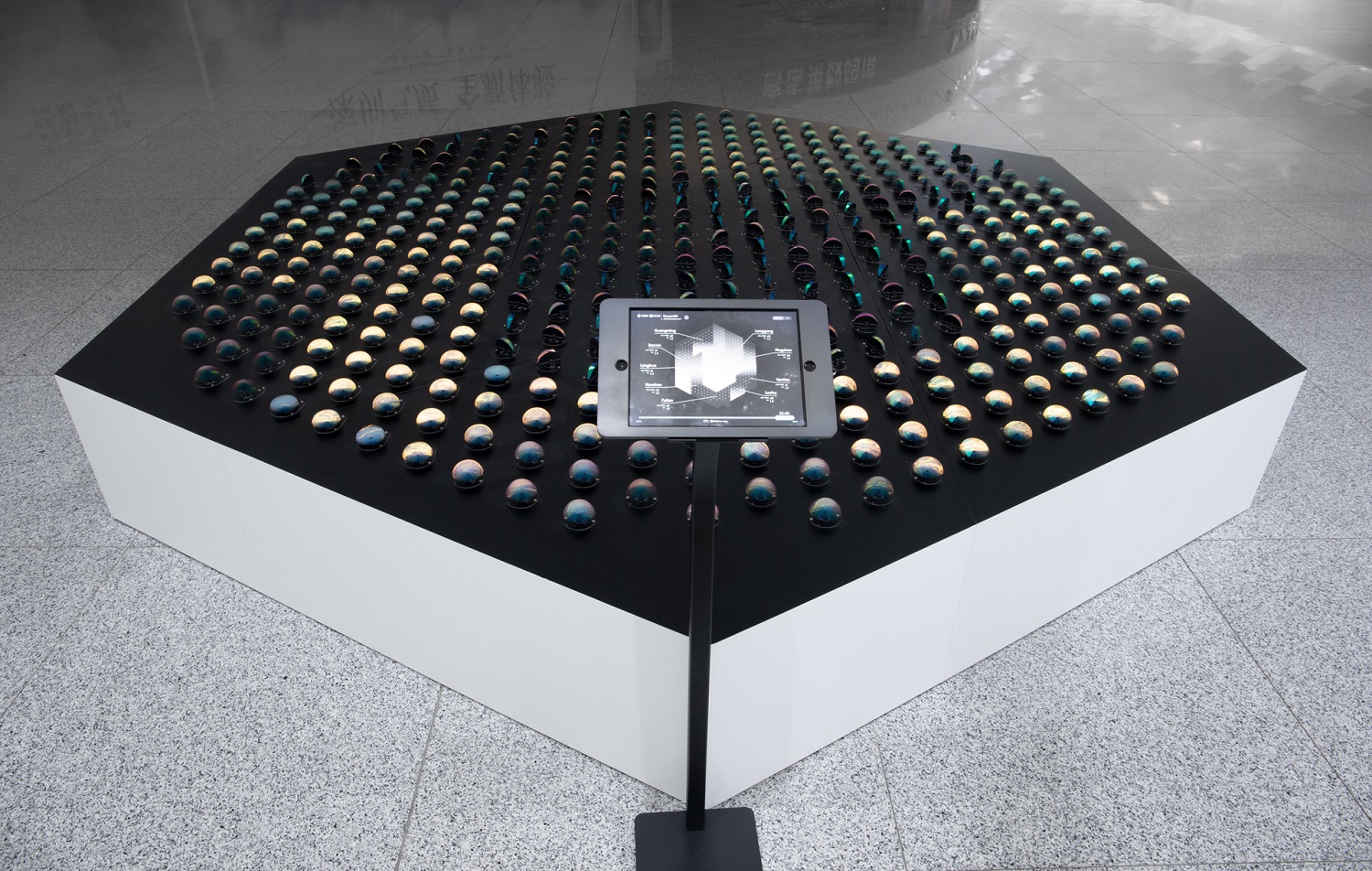 Projekt składa się z 451 autorskich kinetycznych modułów, zaprojektowanych od podstaw na potrzeby tej realizacji, zaaranżowanych na powierzchni heksagonalnej struktury o średnicy czterecgh metrów. Każdy z modułów indywidualnie reaguje na światło rzucane z projektora umieszczonego powyżej, dzięki czemu możliwa jest precyzyjna synchronizacja wszystkich elementów i animacja całej powierzchni. Światło przekładane jest na ruch obrotowy dysków, które wirując rozwierają się dzięki sile odśrodkowej, ujawniając subtelnie opalizujące wnętrze kontrastujące z czarną powierzchnią obiektu.