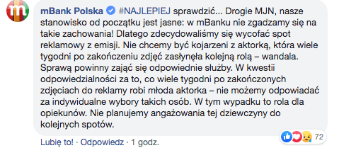 Sprawę nagłośnili użytkownicy Wykopu, którzy nie pozostawili na dziewczynie suchej nitki. Do reakcji wezwano również mBank, w którego reklamie wystąpiła niedawno instagramerka. Spot wycofano z emisji oraz usunięto z kanału na Youtubie. Współpracę z nastolatką zerwała też agencja modelek. Całe oświadczenie banku znajdziecie poniżej: