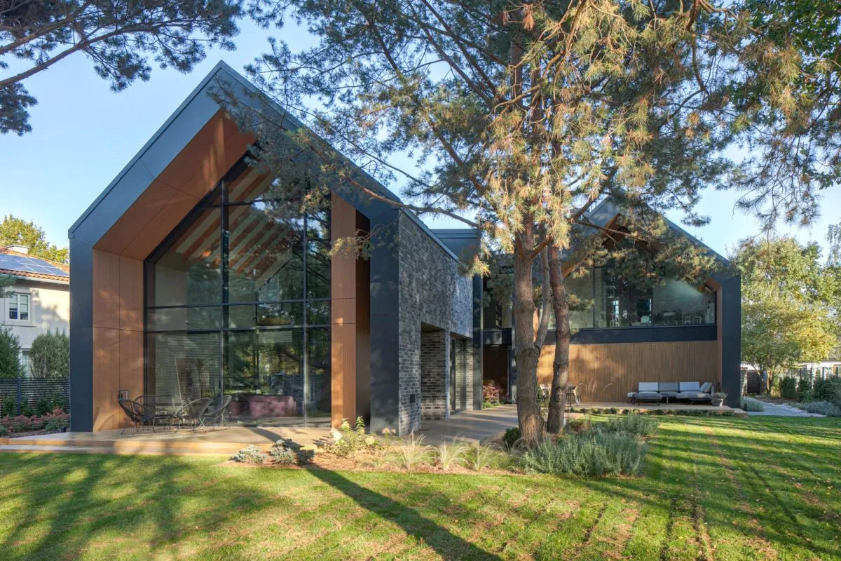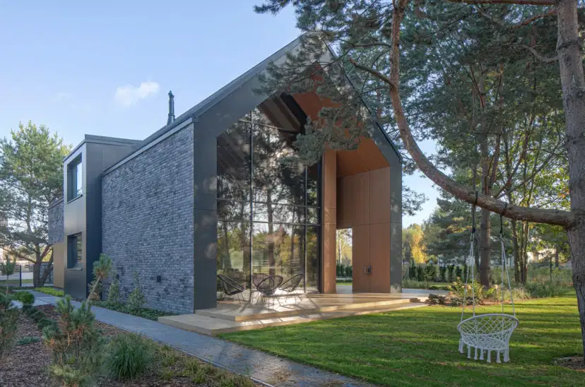 Jego powierzchnia użytkowa licząca dokładnie 351,61 m2 plus garaż wymusiła funkcjonalny podział na dwie bryły. W taki sposób powstał naturalny dziedziniec wejściowy od frontu działki oraz prywatny ogród na tyłach domu. Elewacje zostały wykończone grafitowymi płytkami klinkierowymi, natomiast wnęki oraz podcienie obłożone płytami HPL w odcieniu jasnego drewna. Dzięki takiemu zabiegowi z wnętrza domu widoczne są głównie jasne elementy, co sprzyja wrażeniu przytulności. Budynek zrealizowany został w konstrukcji tradycyjnej murowanej z elementami monolitycznymi jak strop, belki, wieńce i słupy.
