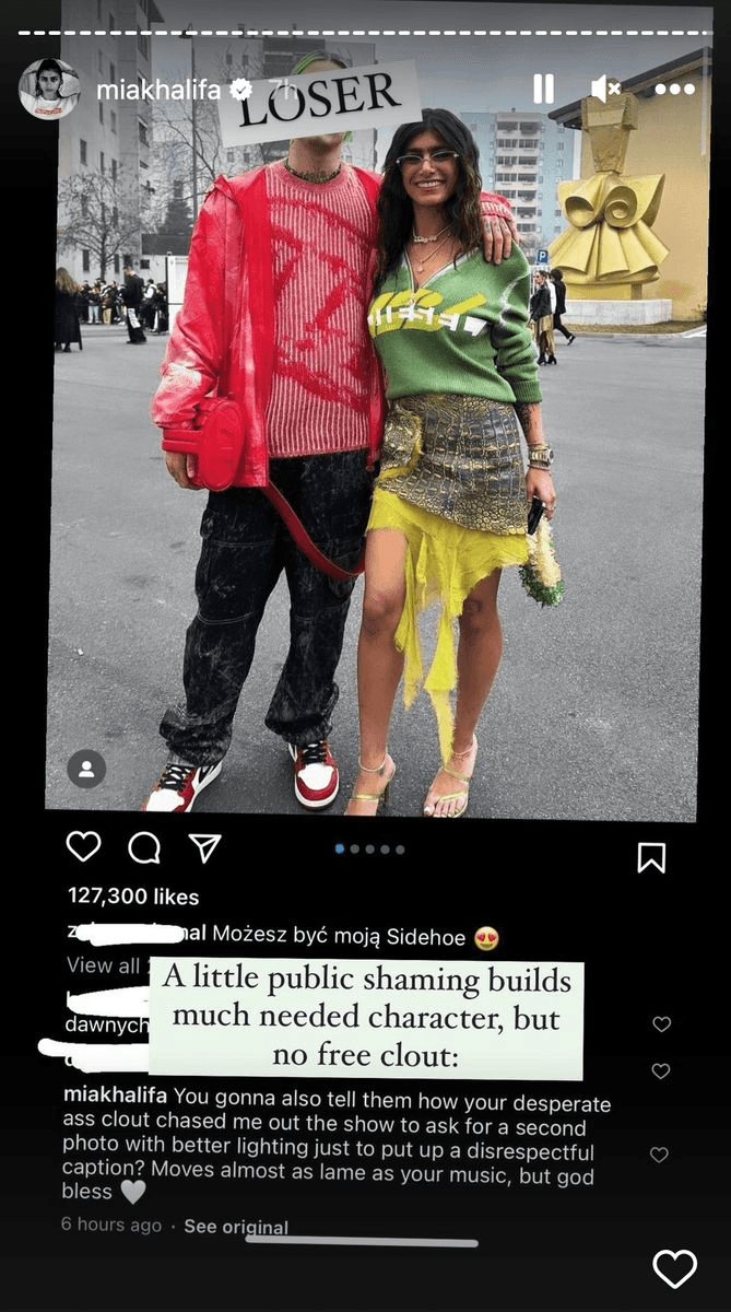 Gwiazda, którą obserwuje na Instagramie blisko 30 mln osób, udostępniła również na Instastories screen postu Żabsona i swojego komentarza. Zasłoniła mu oczy białym paskiem z podpisem „Frajer”. „Odrobina publicznego upokorzenia kształtuje charakter, ale nie zapewnia darmowej sławy” – skwitowała. Ostatecznie Żabson przeprosił, a Mia Khalifa przeprosiny przyjęła.