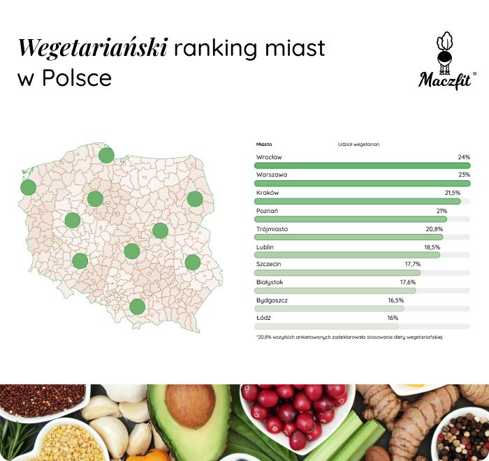 Maczfit zebrał informacje o pochodzeniu ankietowanych i stworzył wegetariański ranking miast w Polsce.