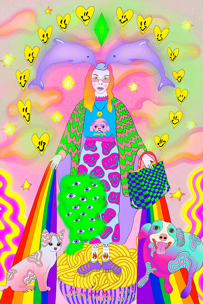 Zakochałam się w mojej dziewczynie, trochę (bardzo) dzięki jej sztuce. Po raz pierwszy zobaczyłam jej prace przez udostępnienia moich znajomych na InstaStories. Na początku, będąc totalnie onieśmielona wyrazistością prac i nią samą, zaczęłam śledzić jej konto z takim: „Hmm, chyba wreszcie wiem, co to oznacza mieć crusha”. Jednego wieczoru, będąc po piwku, trochę przerażona napisałam do niej. Krótko po tym wylądowałyśmy na pięciodniowej randce. I tutaj faktycznie sztuka ma moc zmieniania rzeczywistości, bo nie dość, że żyjemy razem, to czynnie występujemy w swoich projektach i pracach.