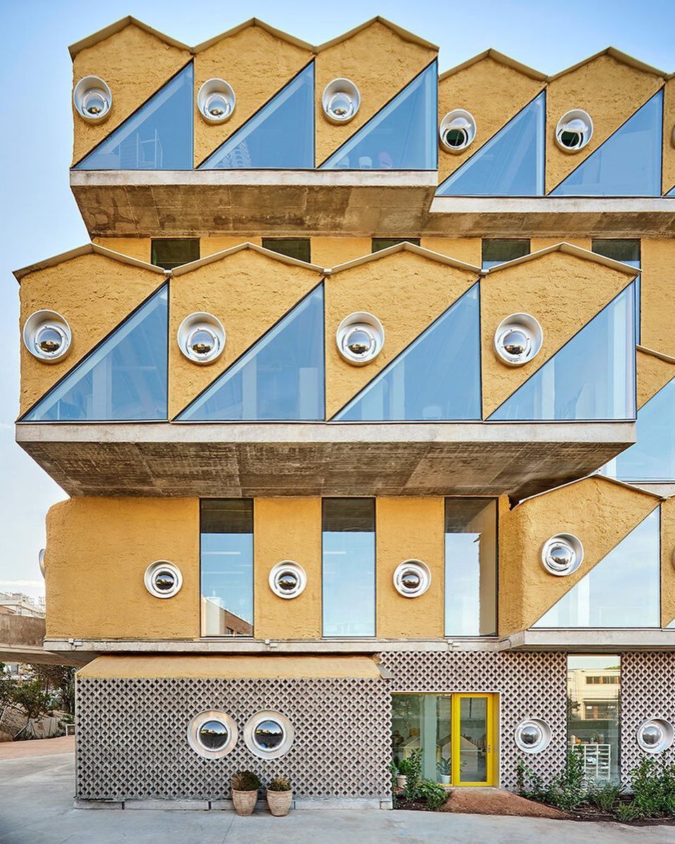„Wygląda jak robot zrobiony z masła”, skomentował jeden z uczniów, kiedy po raz pierwszy zobaczył budynek. Szkoła jest prawie cała w kolorze żółtym, ma okrągłe, bąbelkowe okna oraz dach w kształcie zygzaka.