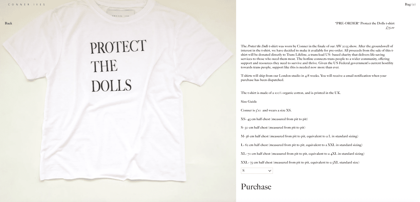 Connor Ives zaprezentował koszulkę świstu podczas swojego pokazu kolekcji ready-to-wear na jesień 2025, który zamknął London Fashion Week. „Dolls” to pieszczotliwe określenie używane wobec transpłciowych kobiet w społecznościach LGTQ+. Hasło jest komentarzem do ostatnich wydarzeń. Po ponownym objęciu fotelu prezydenta USA, Donald Trump ogłosił, że od tej pory rząd USA będzie uznawał tylko dwie płcie: damską i męską.