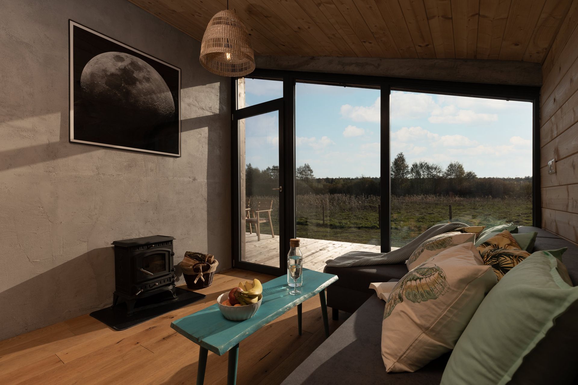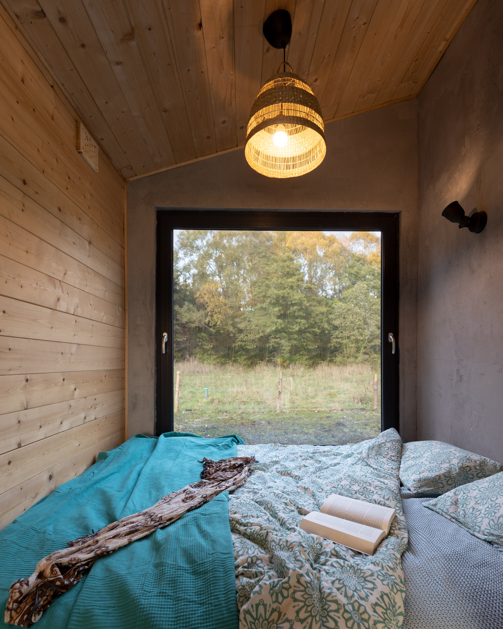 Nazwa „Ukryj się” powstała z myślą, by domek stał się kryjówką i ucieczką od codzienności dla odwiedzających. Zaprojektowany został jako część krajobrazu, a nie obiekt znajdujący się obok niego. Nie jest to hotel, lecz sielankowa chatka z własnoręcznie wybudowaną sauną fińską, hamakiem i kominkiem. Skonstruowana, by wypocząć z dala od zgiełku. Lokalizacja sprawia, że klienci mogą odciąć się od zmartwień dnia codziennego i włączyć tryb slow. Widok z okna sypialni rozpościera się na ścianę lasu. W części wypoczynkowej przeszklona ściana prowadzi wzrok w stronę jeziora. Długie wieczory umila trzask palonego drewna w kominku.
