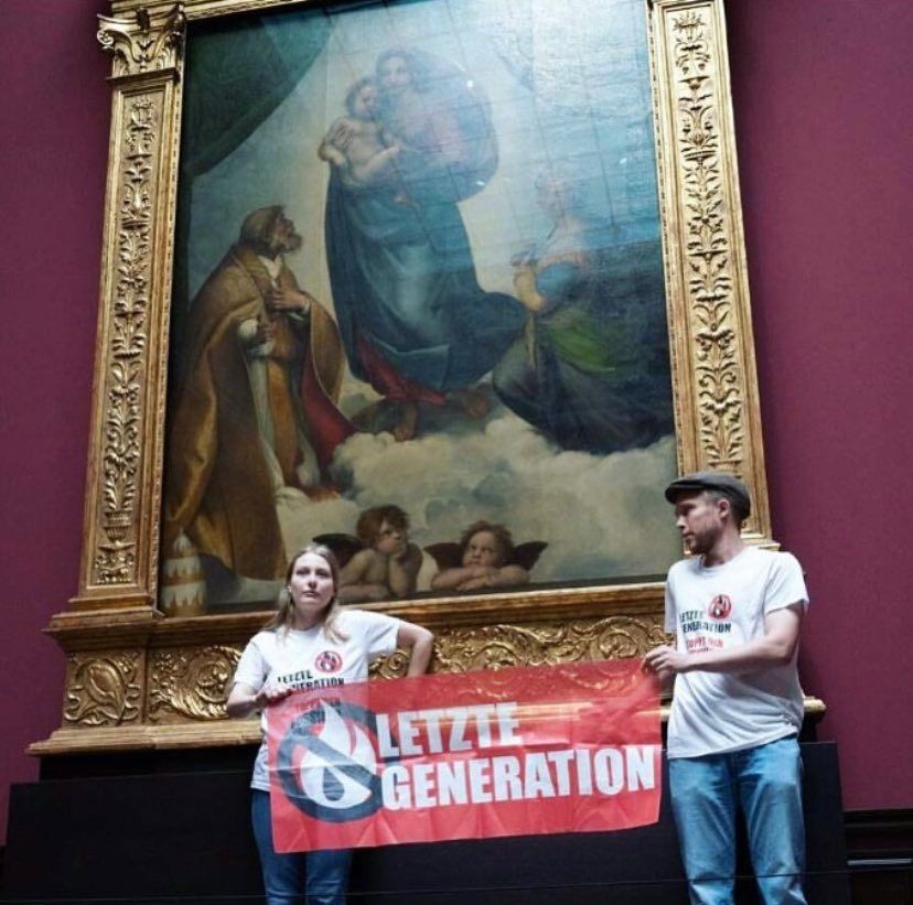 Tym razem postanowili pójść o krok – za pomocą taśmy klejącej umocowali się do znanych, zabytkowych dzieł sztuki. Są to między innymi „Madonna Sykstyńska” Rafaela Santi czy „Ucieczka do Egiptu” Lucasa Cranacha w muzeum w Berlinie i „Burzliwy krajobraz z Pyramusem i Thisbe”, autorstwa Nicolasa Poussina w muzeum we Frankfurcie nad Menem. Ostatnie zniszczenia zostały dokonane na XVII-wiecznej „Rzezi niewiniątek” Petera Paula Rubensa w Starej Pinakotece w Monachium.