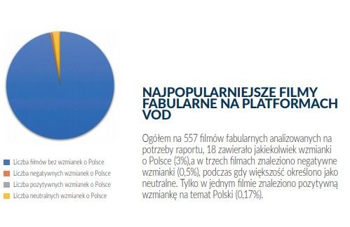 Jedynie w 3 obejrzanych filmach fabularnych znaleziono negatywne wzmianki o Polsce, natomiast wśród analizowanych 47 filmów dokumentalnych, w 17 (36%) stwierdzono szkodliwe przekłamania wobec Polski.