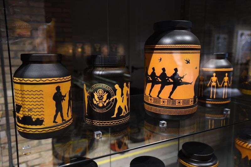 Wróćmy do Bartka Górnego, artysty-rowerzysty, który swój projekt rozpisał na kilku poziomach. Na szczęście przekaz jest uniwersalny i czytelny pod każdą szerokością geograficzną. W hali wystawowej, zanim jeszcze Górny dotarł do Wenecji, stanęły w przeszklonych gablotach wielkie plastikowe słoje po suplementach dla sportowców. Zostały przez Bartka pokryte malowidłami, na wzór antycznych waz i kamfor. Znalazły się na nich obrazy z ważnych dla artysty wydarzeń z 2018 roku, m.in.: pożar katedry Notre Dame (Francja), morderstwo dziennikarza Jana Kuciaka (Słowacja), atak chemiczny (Syria) czy śmierć ostatniego białego nosorożca (Kenia). To obrazkowo zaserwowana współczesna historia, zresztą w tych samych kolorach, jakie wybierali starożytni Grecy (czerń i pomarańcz).