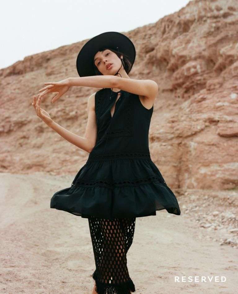 W damskiej kolekcji główną rolę grają sukienki. Wyróżniają się te koronkowe, romantyczne oraz ażurowe, przypominające sieć rybacką. Z siatek w różnym wydaniu projektanci Reserved szyją także spódnice. Mocnym akcentem są też sukienki zdobione falbanami w stylu flamenco i dopasowane tuniki w pasy. Do stylu festiwalowego nawiązują motywy wzoru tie die, który lata temu narodził się w Kalifornii. Z kolei bluzki i szerokie spodnie w kolorze miedzi wyglądają wprost jak z wąskich uliczek targów w Marakeszu. Minimalistkom do gustu przypadną koronkowe bluzki w wiktoriańskim stylu z baskinką, prosty lniany trencz czy asymetryczny sweter z jednym rękawem. Skórzane saszetki na szyję, mini koszyki i worki to idealne uzupełnienie na wskroś nomadzkiej kolekcji.