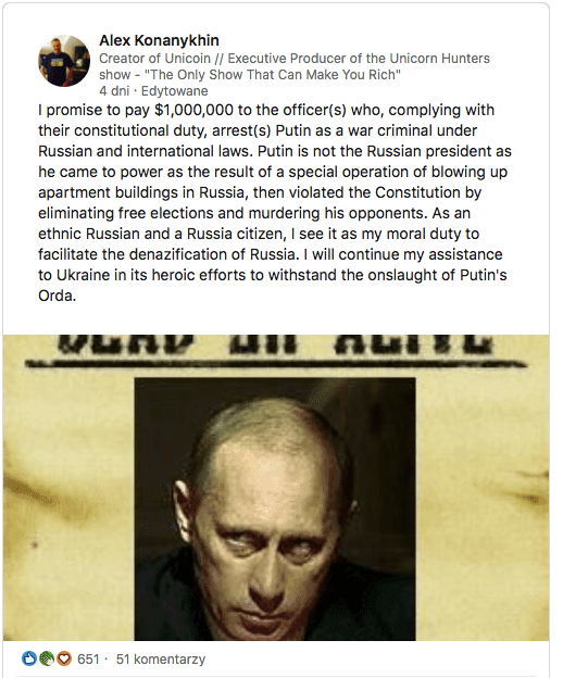 Rosyjski biznesmen Alex Konanykhin opublikował w mediach społecznościowych post, w którym zwrócił się do rosyjskich oficerów, oferując im nagrodę w wysokości miliona dolarów za aresztowanie prezydenta Rosji Władimira Putina. W pierwszym poście pojawił się plakat ze zdjęciem Putina oraz napisem „poszukiwany żywy lub martwy", ale Facebook go usunął. Niedługo później Konanykhim opublikował go raz jeszcze, tym razem bez plakatu.