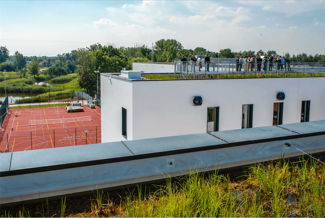 To właśnie dlatego „Zielony dach typu bagiennego” wieńczący szkołę w Markach jest tak nieoceniony. A dodatkowo ma właściwości oczyszczające powietrze, tłumi hałas, magazynuje wodę opadową, odciąża sieć kanalizacyjną, jest doskonałym siedliskiem dla wielu gatunków fauny i flory, a odpowiednio zagospodarowany pełni funkcje rekreacyjne. To cztery tysiące metrów kwadratowych prawdziwego bagna, porośniętego szuwarami przywiezionymi tu prosto z Kaszub. Stopniowo bagienny dach będzie zasiedlany, by życie mogło rozkwitnąć tu na wiosnę. Na razie są tu tylko małe organizmy, które trafiły tu wraz z roślinami.