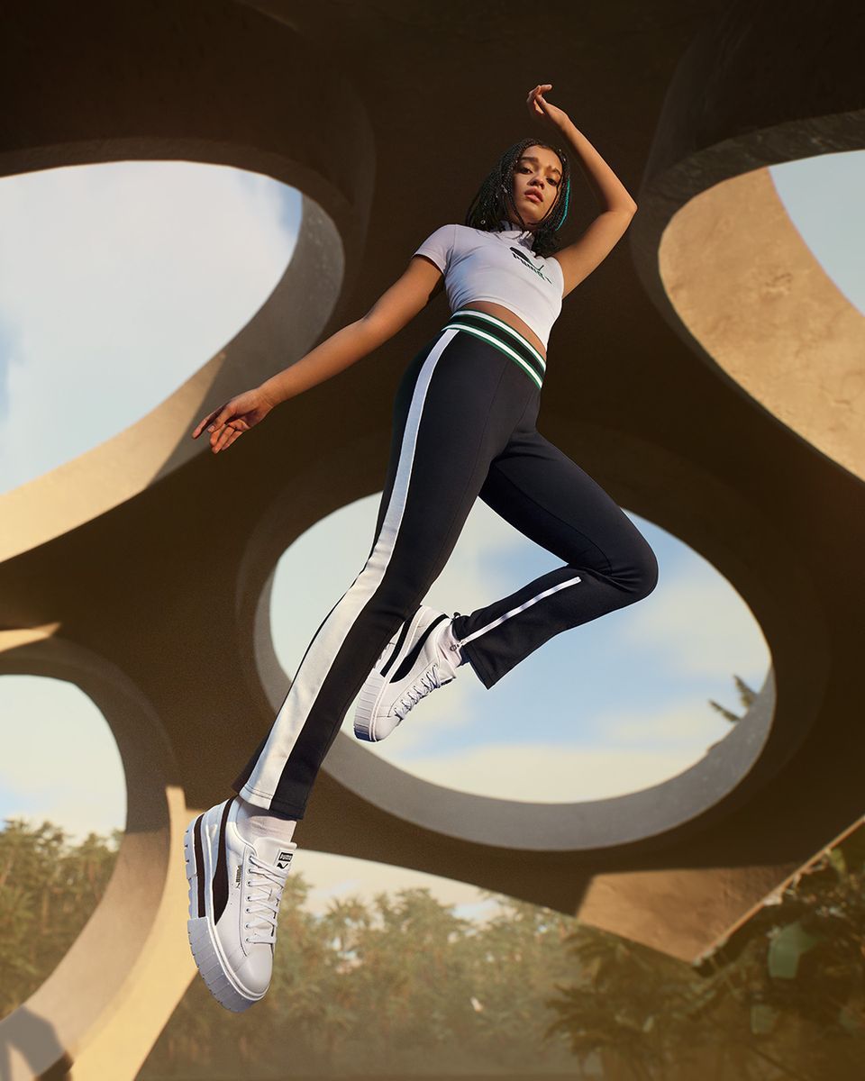 Bohaterki spotu noszą na sobie najnowsze kolekcje PUMA, m.in. kultowy dres T7 czy granatowy set DARE TO. Wszystkie sylwetki są idealnym dopełnieniem głównego bohatera - butów PUMA Mayze. Najnowsza odsłona to model w klasycznym białym kolorze ale z trzema różnymi wariantami detailingu.