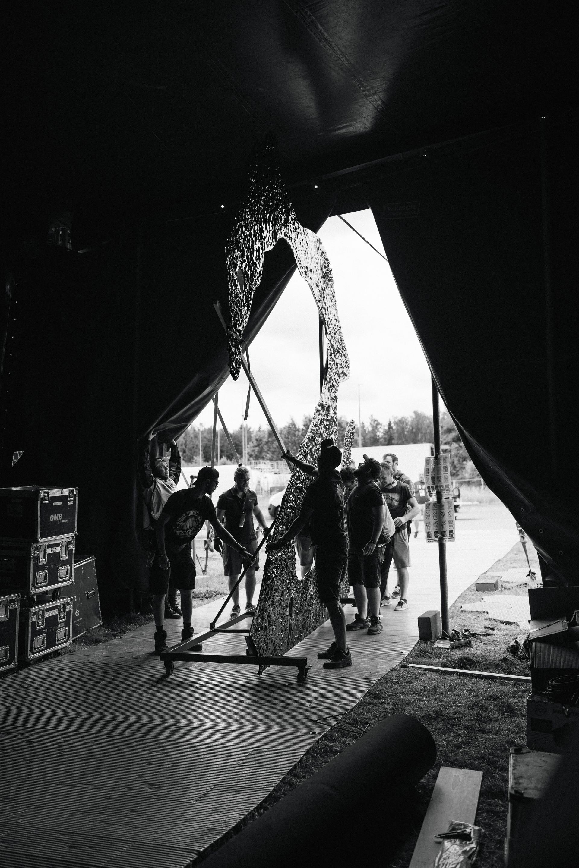 Za kulisami Open'erowego tentu panował względny ład. Chwilę po godzinie 10 wjechało tam kilka ciężarówek ze wszystkim, co potrzebne do realizacji całego przedsięwzięcia. Setki dokładnie opisanych skrzyń z mikserami, kablami, mikrofonami, światłami i elementami naprawdę wyjątkowej scenografii. Próba rozpoczęła się prawie punktualnie, chwilę po zejściu ze sceny Tinashe i jej tancerzy. Czas przewidziany na „przeinstalowanie” artystów na scenach festiwalu to dosłownie kilka chwil, co oznacza, że część prób również powinna utrzymywać szybkie tempo.