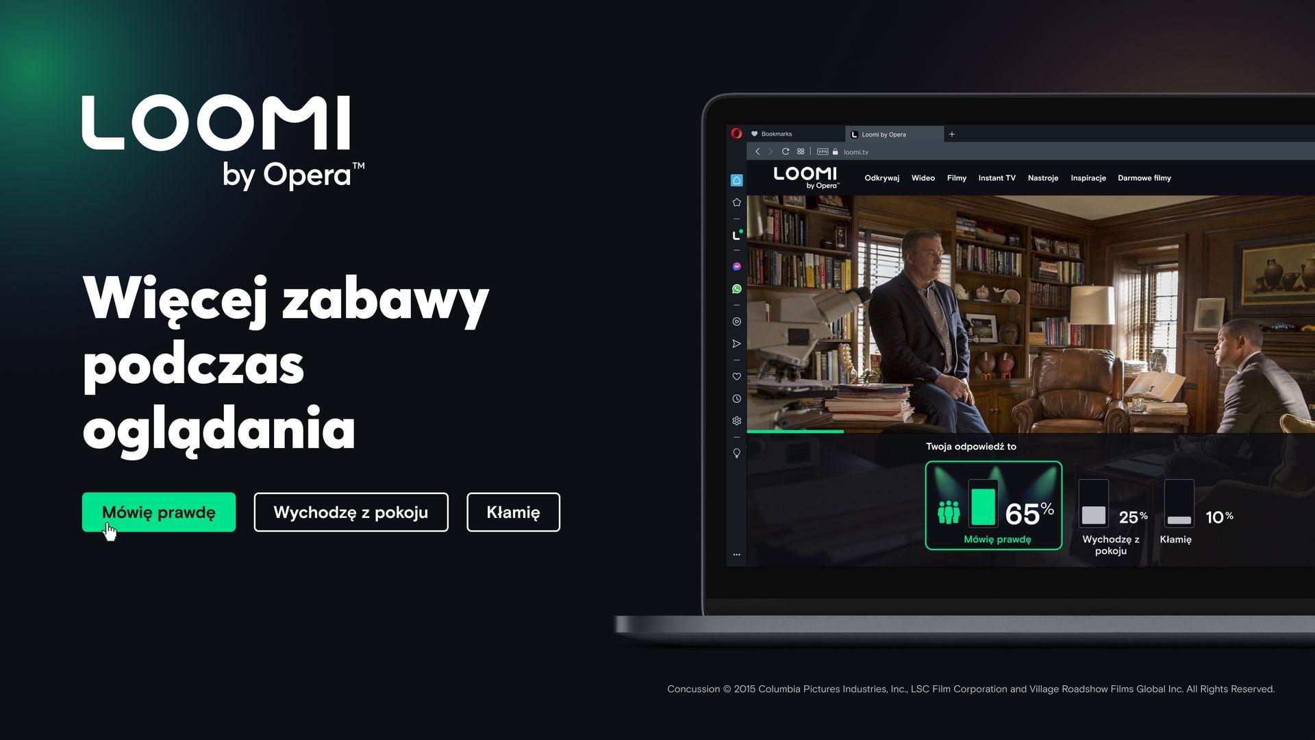 Opera, twórca przeglądarki wybieranej przez setki milionów internautów na całym świecie, udostępnia w Polsce finalną wersję swojej nowej platformy VOD - Loomi. Nowy serwis rewolucjonizuje sposób oglądania, umożliwiając wyświetlanie reakcji użytkowników na osi czasu filmów. Każdy może podzielić się swoją opinią, komentując konkretną scenę oraz zobaczyć reakcje i uwagi innych użytkowników. Ta funkcja jest dostępna dla wszystkich 669 filmów w Loomi. Nowy serwis VOD to także innowacyjna możliwość oglądania filmów z komentarzem objaśniającym autorstwa znanych influencerów, dziennikarzy i krytyków.