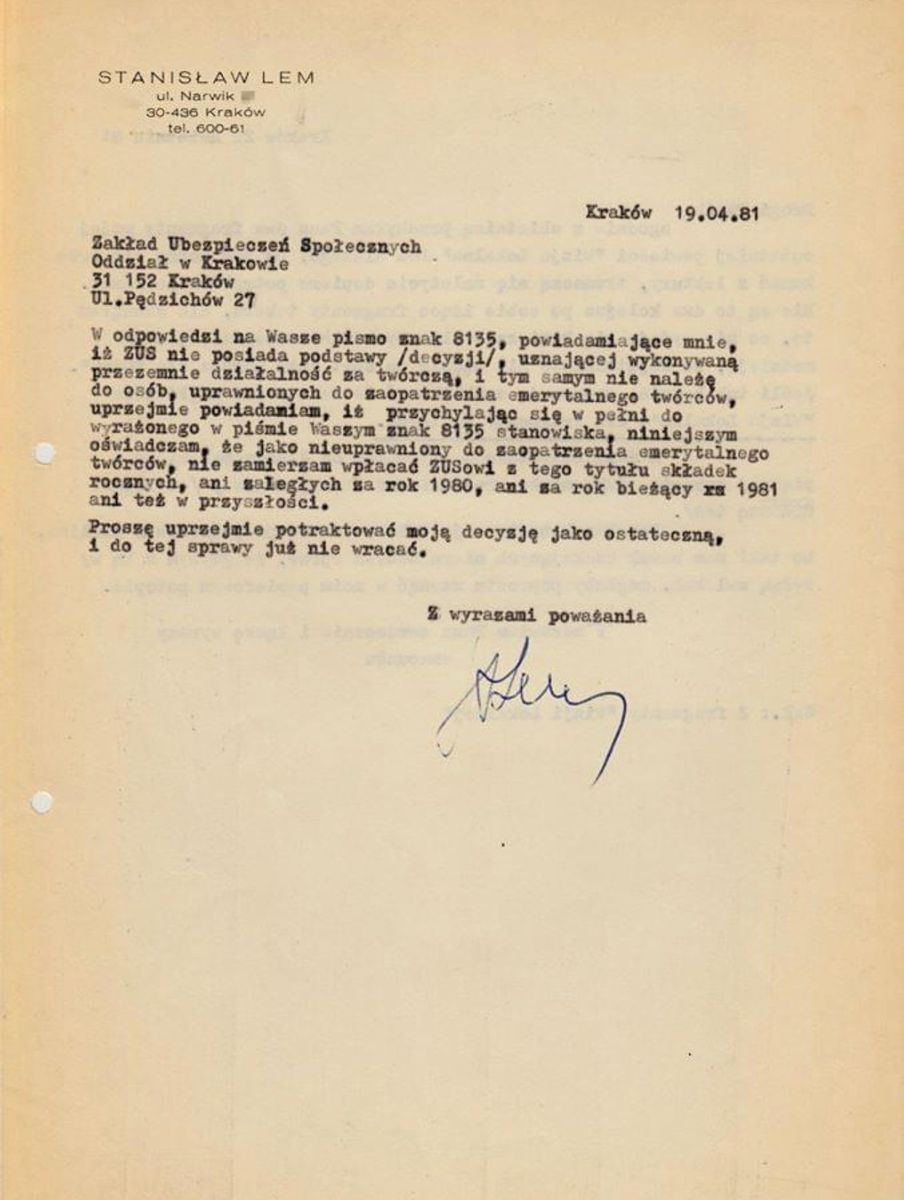 Ostatnio do sieci trafiło pismo z lat 80-tych opublikowane przez Błażeja Torańskiego, które opisuje skomplikowaną sytuację Stanisława Lema i Zakładu Ubezpieczeń Społecznych. Według ZUS-u Stanislaw Lem nigdy nie był twórcą, w związku z czym pisarz zbuntował się i postanowił nie opłacać należnych urzędowi składek. Jak czytamy w piśmie wystosowanym przez Lema: