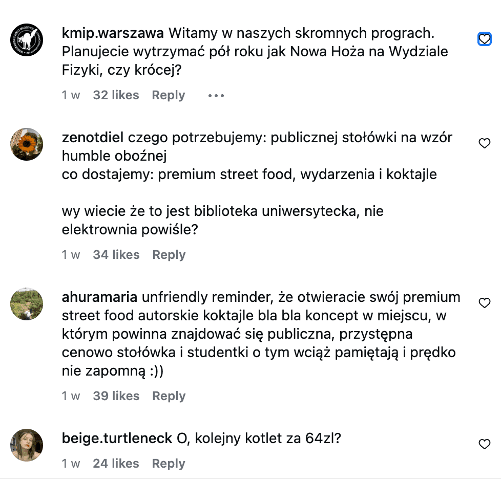 Po niezbyt przyjaznym przyjęciu konceptu „Premium” lokal zdecydował się zmienić taktykę. W drugim opublikowanym na Instagramie poście stara się zjednać sobie studentów, odsłaniając fragment swojego menu: kawa do śniadania za 1 zł, przelew dnia za 5 zł, zupa w kubku za 5 zł, danie obiadowe od 19 zł, delikatesy zero waste.
