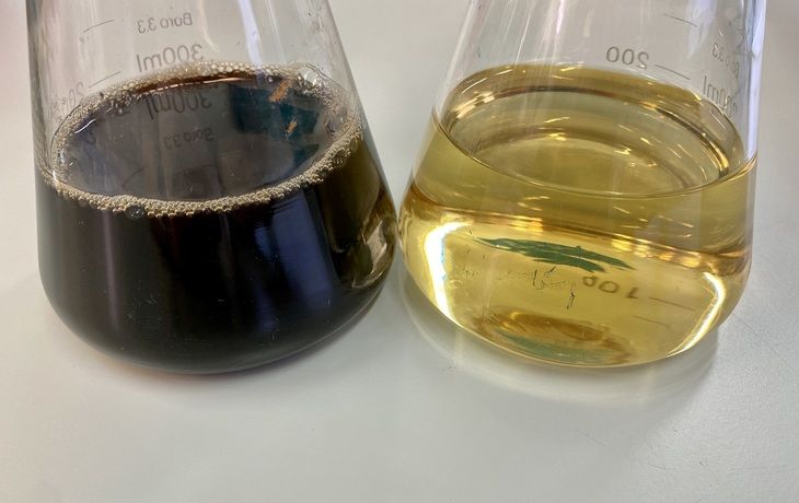 Kolba z żółtym płynem – pożywka dla bakterii antarktycznych. Obok kolba z ciemnym płynem – hodowla bakterii z obfitym produktem metabolicznym, czyli związkiem z grupy melanin. / fot. Michał Styczyński