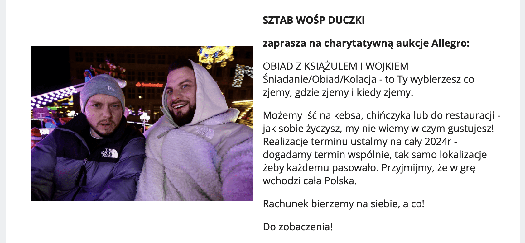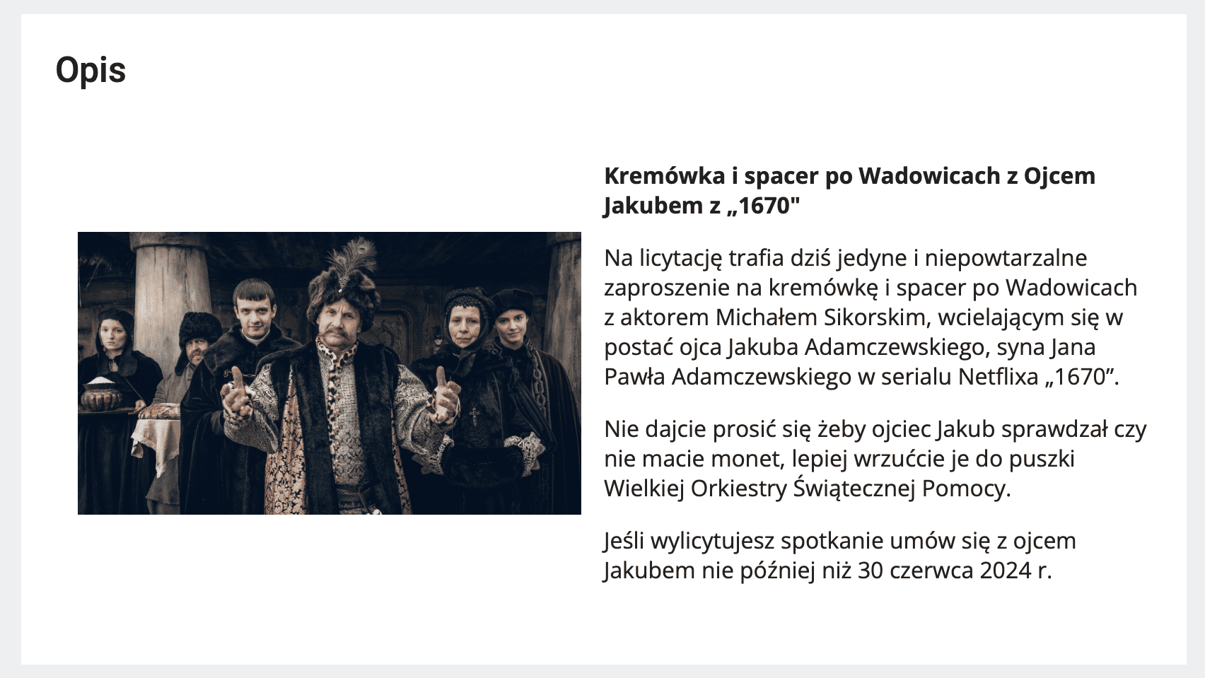 Maciej Musiałowski zaprasza na kolację i zwiedzanie zamku w Domanicach. Dla fanów serialu „1670” do wygrania jest spacer po Wadowicach i kremówka z Ojcem Jakubem, a także spotkanie z Zofią i Janem Pawłem przy ziemniaczanym posiłku. Bartłomiej Topa i Katarzyna Herman oferują spotkanie w Pałacu Mała Wieś, które już po dwóch dniach osiągnęło cenę 15 400,00 zł. Julia Wieniawa i TVN zapraszają do licytacji wizyty na planie „Mam Talent”. Dla miłośników jedzenia i YouTube’a, Książulo wystawił na WOŚP spotkanie z nim i obiad. Możliwość spędzenia weekendu na grze w golfa oferują Omena Mensah i Rafał Brzoska – licytacja „Golfowego weekendu w Marbelli” osiągnęła już cenę 160 100,00 zł.
