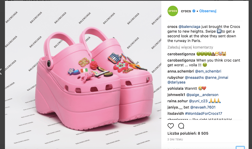 Hitem były oczywiście crocsy na platformie wysadzane kiczowatymi przypinkami.