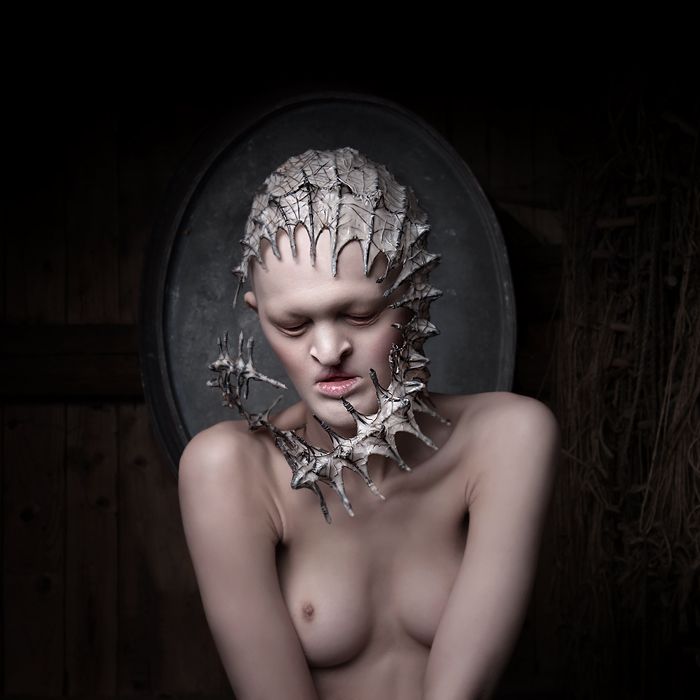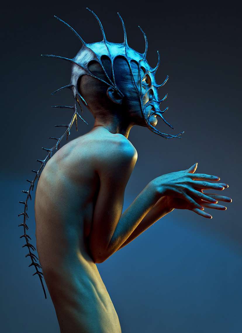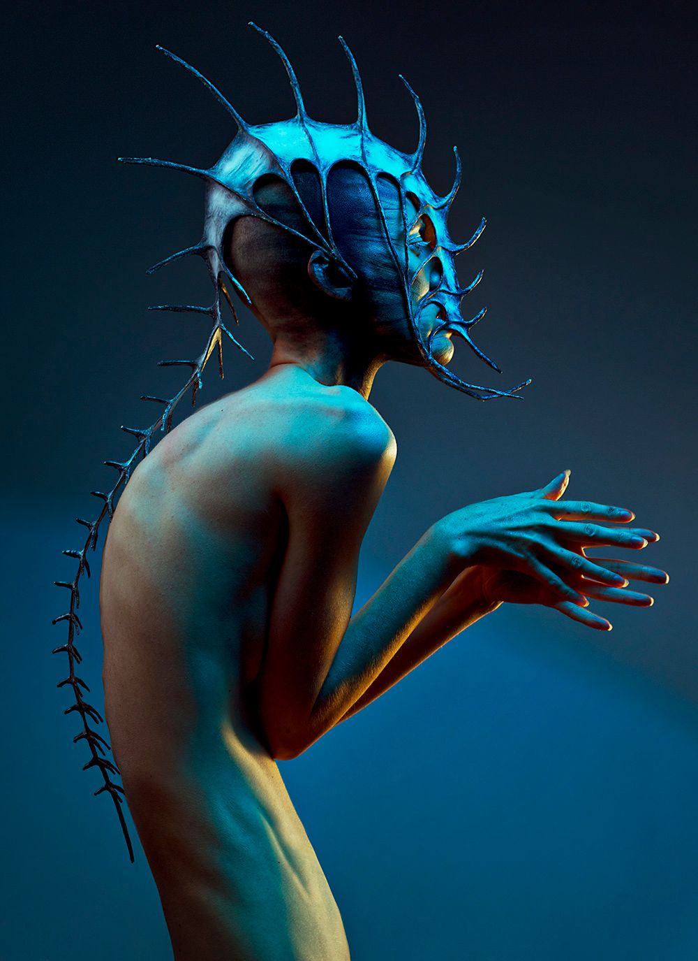 Nika: Na samym początku mojej twórczości główną inspiracją była anatomia i moje prace były niejako hybrydami różnych anatomii, zarówno ludzkiej jak i innych gatunków. Skupiałam się na kręgosłupie i na nim budowałam resztę konstrukcji. Chłonęłam dużo takich twórców jak Beksiński czy Giger, co było bardzo widoczne w moich pierwszych pracach. Dzisiaj to oczywistość, Beksiński wisi już wszędzie, w najbardziej nawet oczywistych miejscach, powstało wiele filmów obdzierających tego twórcę z prywatności i kiedy myślę o nim jako jednej z moich pierwszych fascynacji czuję wręcz element zażenowania, że teraz jest to sztuka zbyt oczywista. Ale w latach osiemdziesiątych i dziewięćdziesiątych nic nie było oczywiste. Pojawienie się ósmego pasażera Nostromo przyprawiło nas o ciarki, ale też totalnie ogarnęło wyobraźnię wielu z nas. Zrozumiałam, że szkielet może zarówno przerażać, jak i fascynować w zależności od formy w jakiej się go przedstawi. Wiedziałam też, że bez dobrej znajomości anatomii nigdy nie będę tworzyć przynajmniej przyzwoitych prac. Interesował mnie człowiek i bliżej nieokreślone hybrydy międzygatunkowe. Tworzyłam rzeźbo-lampy, dziwne krzesła i inne obiekty mniej lub bardziej użytkowe, z naciskiem na to pierwsze. Któregoś dnia jeden z fotografów założył taki obiekt na ciało modelki i zaczął się etap, który został ze mną do dzisiaj, obiekty na ciało, po angielsku to ma ładną nazwę wearable art, sztuka do noszenia, ale może być po prostu nazwa kostium.